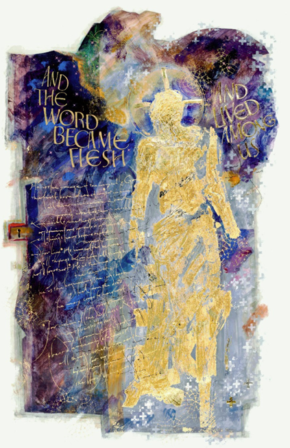 Artist Donald Jackson created the illumination (at left) for the Gospel of John in the St. John’s Bible. The Gospel of John begins with the verse, “In the beginning was the Word, and the Word was with God, and the Word was God.” (1:1) The reference to the Beginning hearkens back to Genesis and the Earth’s formation, and Jackson incorporates the Genesis story by having the central figure of Christ step from the dark unformed universe toward the bright organized world. In The Art of The Saint John’s Bible, Susan Sink develops this idea: