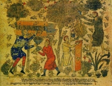 The Exsultet was depicted on a liturgical parchment scroll that contained the texts and chants of the Exsultet accompanied by various decorative illuminations related to the contents of the same. In liturgical practice this scroll would be unrolled by the deacon as he sang the Exsultet from it, allowing it to unroll over the ambo (an oblong pulpit in the early Christian church) as he did so, thereby permitting the faithful to see the related iconography as he sang the liturgical text which corresponded to it. A favorite part of the Exsultet for many is the section that refers to bees and bees wax. The picture above of an early scroll of the Exsultet depicts the scene referring to the bees.