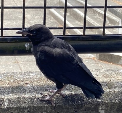 I reached out with the toe of my shoe to gently prod him off the porch, but he only waddled a few steps forward. Are you injured? I asked. Again, no reply. I prodded once more and watched as he stretched his wings long enough to glide down to the landing below the stairs. His wings seemed to work fine. No injury, as far as I could tell. Again I heard the insistent calling from the tree across the street: CAW!! CAW—CAW—CAW!!! And then his weaker reply: CAW! Finally leaving my new young acquaintance, I headed for home… AND… when I arrived back at church this morning, there he was – still; companioned this time by one of his siblings (who was further along the flight curve than he) and a parent crow, who took to CAWING at me vociferously as I tried with soothing tones to let her know that I meant no harm. Walking past the three crows I went inside to learn more about the behavior I was observing.