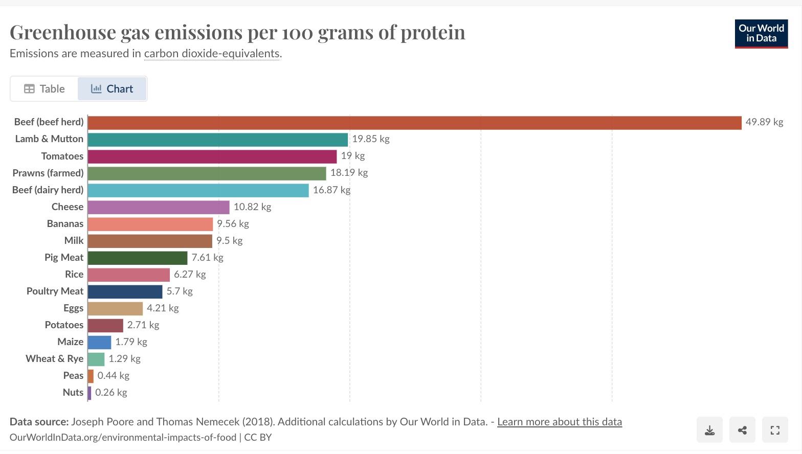 Still, beef is consistently identified as the meat with the highest carbon footprint by far, as shown on charts that compare it to other foods’ equivalence in such things as serving, protein, or weight. For example: